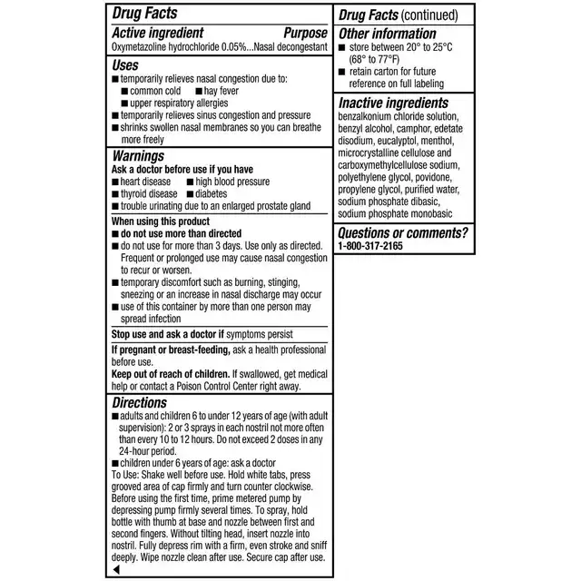 - Spray bottle contains half-ounce of 0.05% oxymetazoline hydrochloride nasal decongestant.