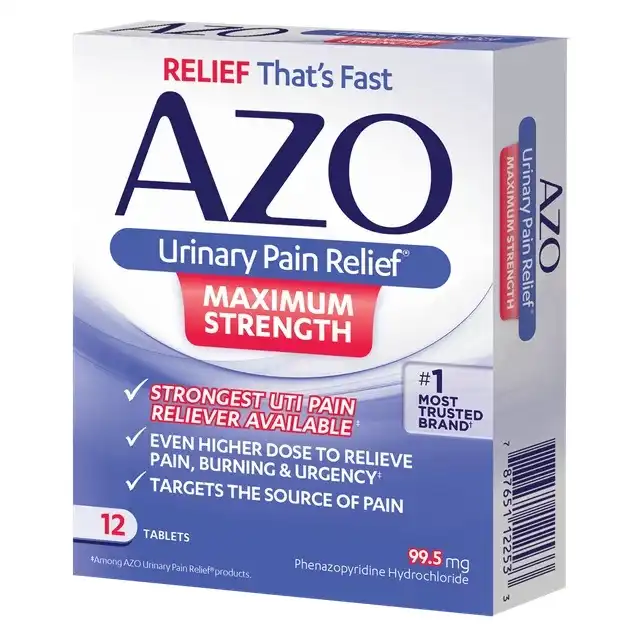 AZO Urinary Pain Relief Maximum Strength is an over-the-counter solution for relieving UTI symptoms. Each tablet contains 99.5 mg of Phenazopyridine Hydrochloride, the active ingredient that delivers fast and effective relief from urinary pain, burning, and urgency.