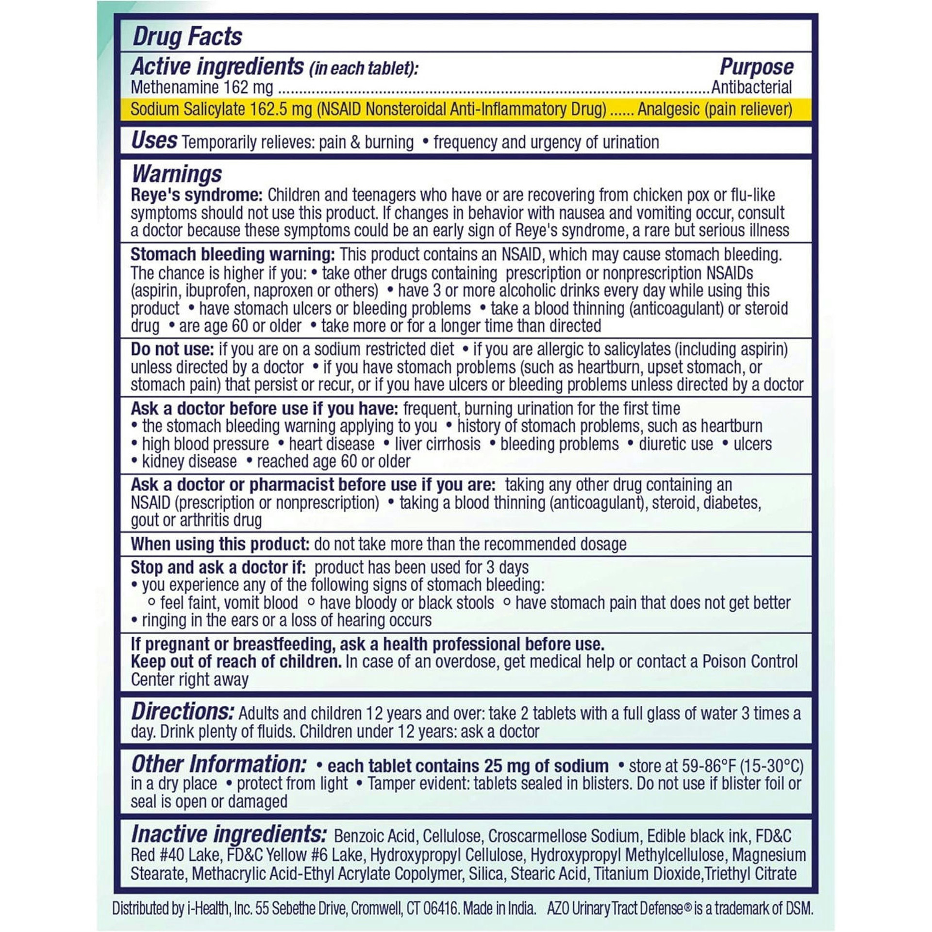 Please consult your doctor if you are taking any other prescription medications before taking AZO Urinary Tract Defense. AZO Urinary Tract Defense should not be taken with sulfonamide drugs. Products that decrease the acidity of the urine (such as antacids, sodium bicarbonate, potassium or sodium citrate, carbonic anhydrase inhibitors such as acetazolamide) may reduce the effectiveness of AZO Urinary Tract Defense. AZO Urinary Tract Defense should not be taken with anticoagulants, steroid drugs, or in addition to other non-steroidal anti-inflammatory drugs (aspirin, ibuprofen, naproxen and others).
