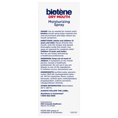 Dry mouth can be caused by some medications or excessive speaking. Dry Mouth can get worse at night; the reduced saliva flow slows down the removal of bacteria that cause bad breath and even oral infection. Use Biotène moisturizing spray whenever your mouth is feeling dry. It provides a quick, on-the-go solution that gives you instant relief from dry mouth. Biotène Moisturizing Spray is alcohol-free and helps freshen your breath.