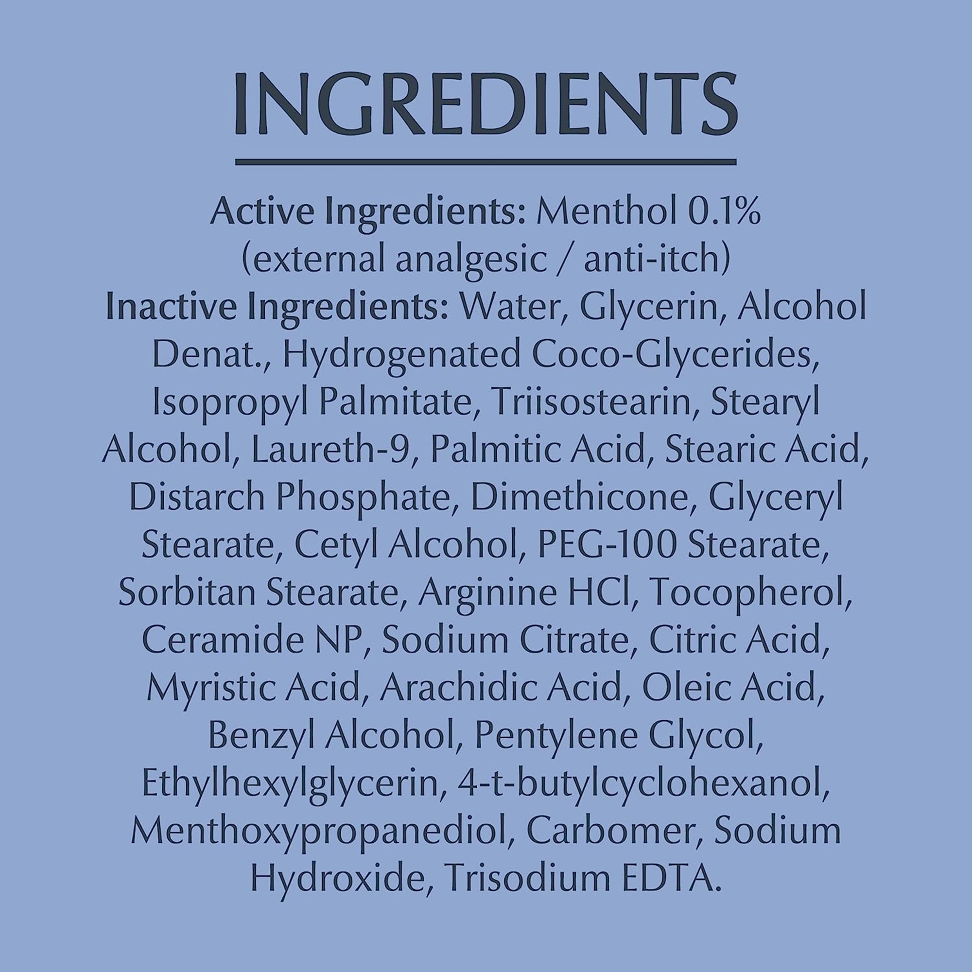 - Formulated with menthol (external analgesic) to provide instant itch relief from dry skin