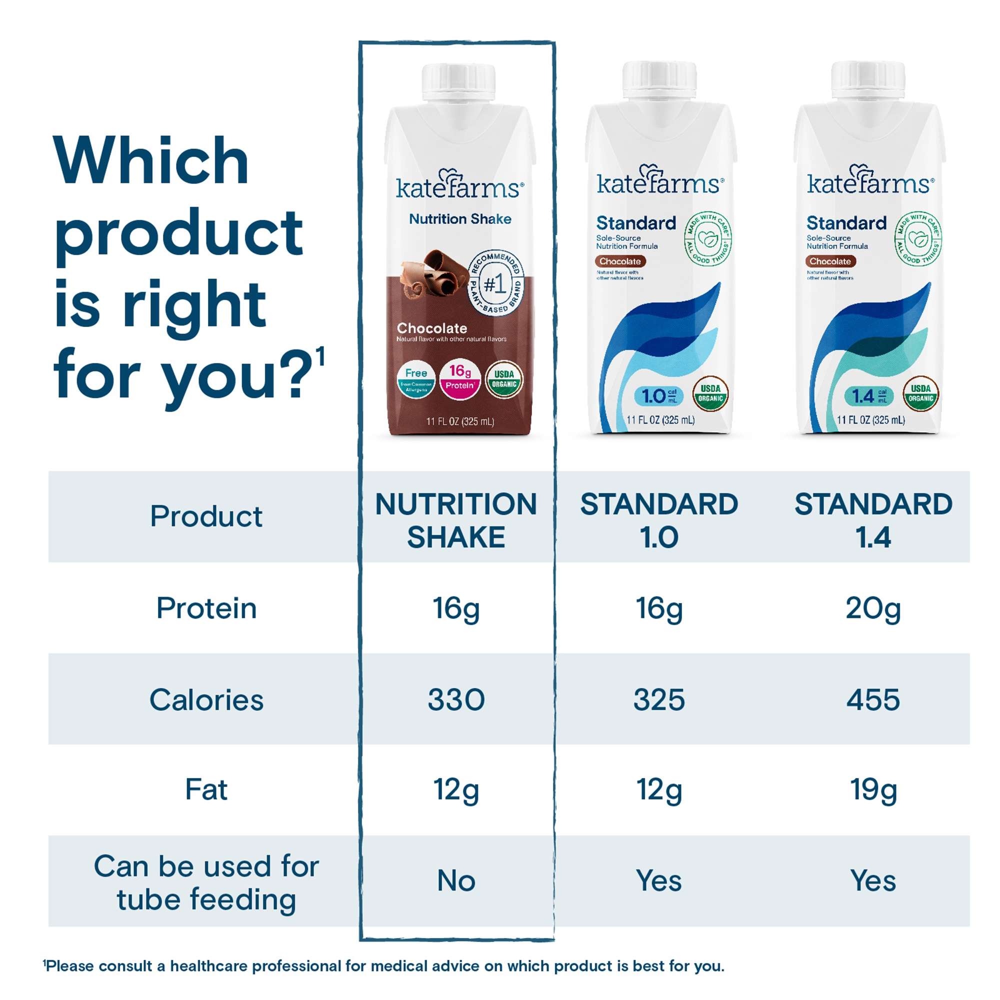 Most Kate Farms products are suitable for both drinking and tube feeding, except for Nutrition Shake, which is designed for oral consumption only. For tube feeding, our formulas flow smoothly through tubes as small as 6.5 French and work with common enteral delivery systems, including: