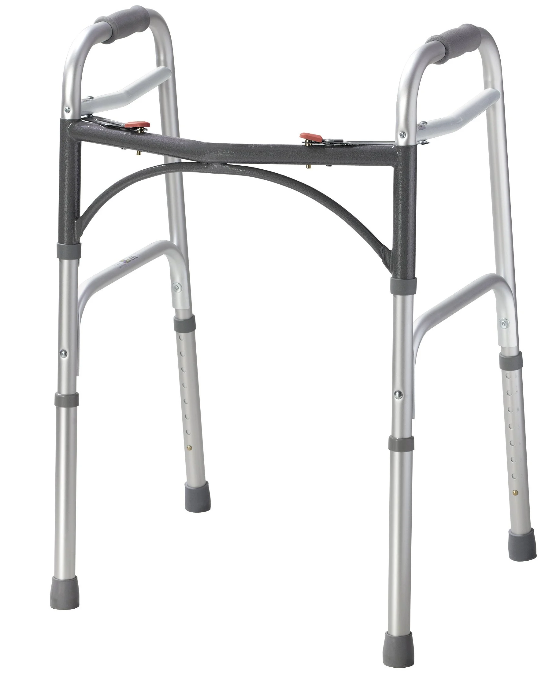 The walker features a dual-release push-button folding mechanism, which can be easily operated using your fingers, palms, or the side of your hand for convenience.