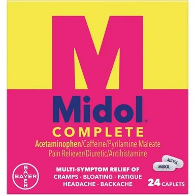 A: Midol Complete helps relieve menstrual cramps, bloating, water-weight gain, fatigue, muscle aches, backaches, and headaches.