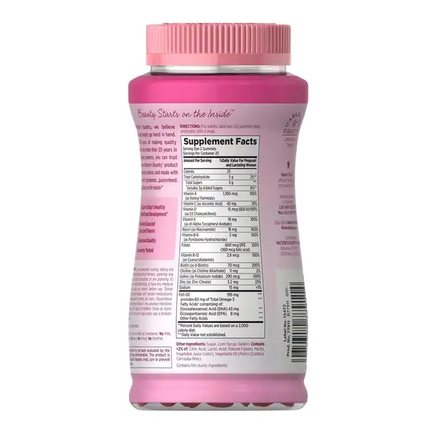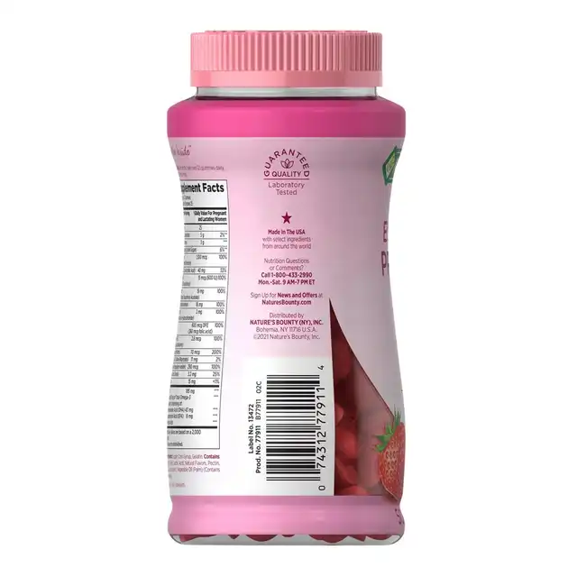Nature’s Bounty Essential Prenatal Gummies are a delicious way to support your health throughout every stage of pregnancy! Packed with 13 essential nutrients, including 100% of the daily value of iodine and folic acid, plus 51 mg of omega-3s EPA and DHA per 2-gummy serving, our high-potency formula is designed to keep both you and your baby healthy. These mixed berry-flavored gummies offer a superior taste compared to other prenatal formulas, making it easy and enjoyable to take your daily dose.