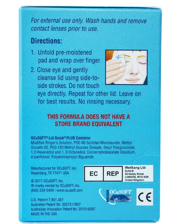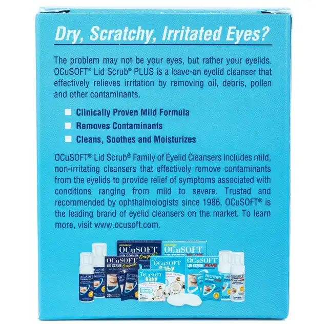 OCuSOFT Lid Scrub Plus is an extra-strength eyelid cleanser designed to remove oil, debris, pollen, cosmetics, and other contaminants from the eyelids and eyelashes. It is ideal for individuals with moderate to severe eyelid conditions, such as blepharitis or dry, irritated eyes.