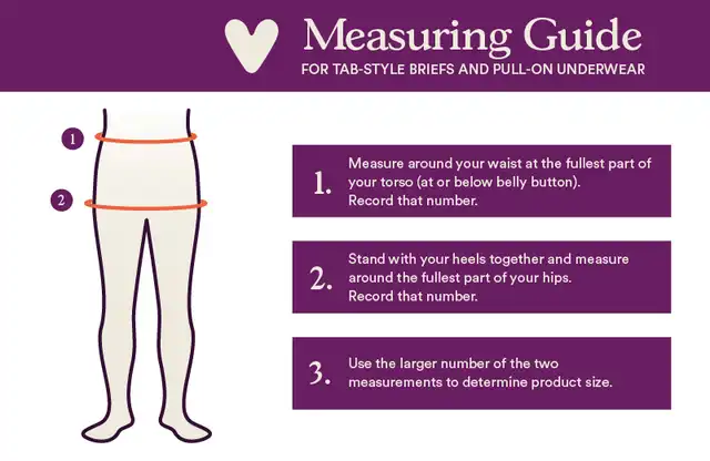 Choosing the correct incontinence product size is not like choosing a clothing size. You’ll need to measure both waist and hip size, and then use the larger of the two numbers when referencing a sizing guide.