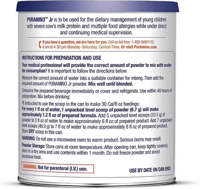 PurAmino Jr is specifically formulated for toddlers and young children with severe cow’s milk allergy, multiple food allergies, or other gastrointestinal conditions. Its hypoallergenic formula, made with 100% free amino acids, minimizes the risk of allergic reactions.