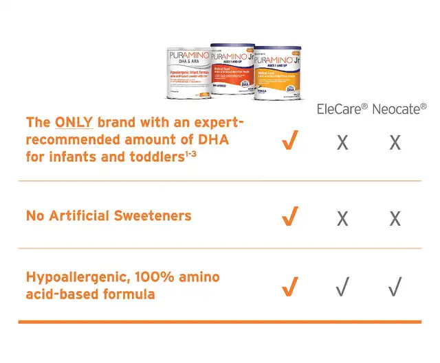 - PurAmino has DHA (docosahexaenoic acid) and ARA (arachidonic acid), important fatty acids that support baby’s brain and eye development.