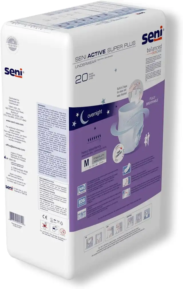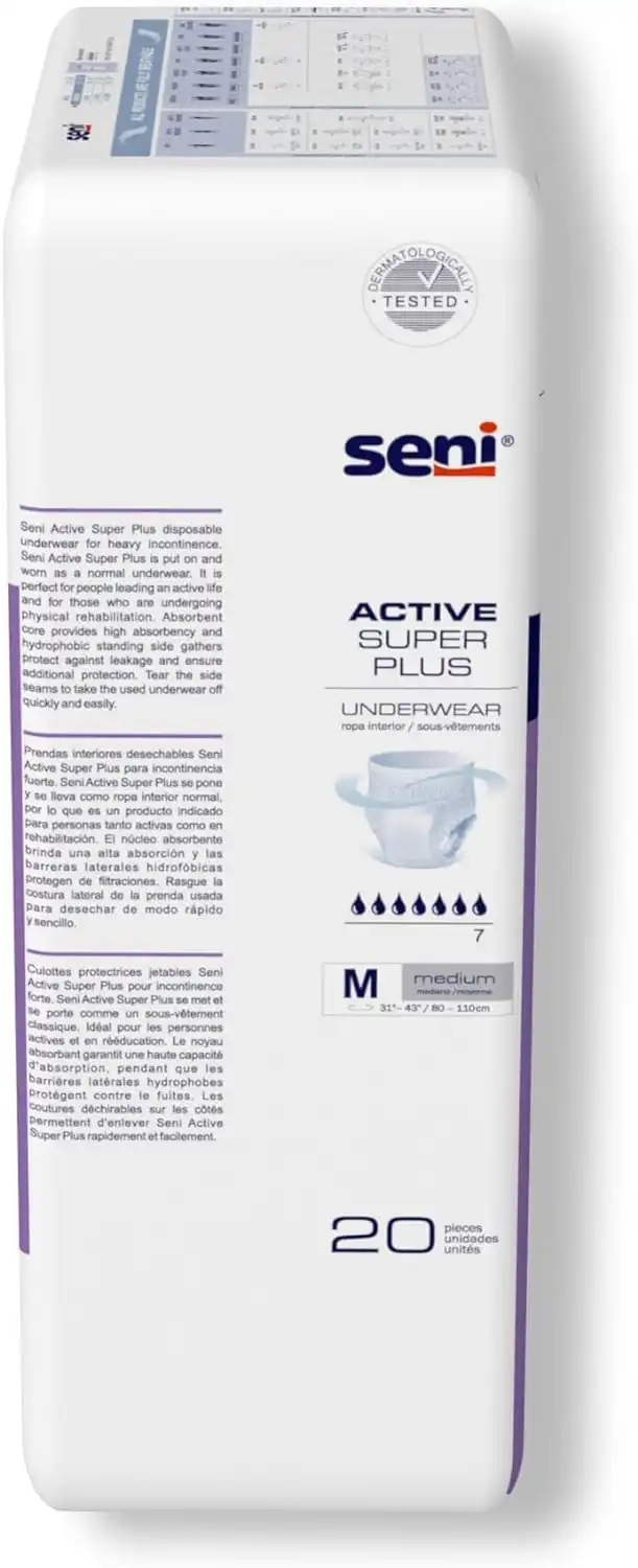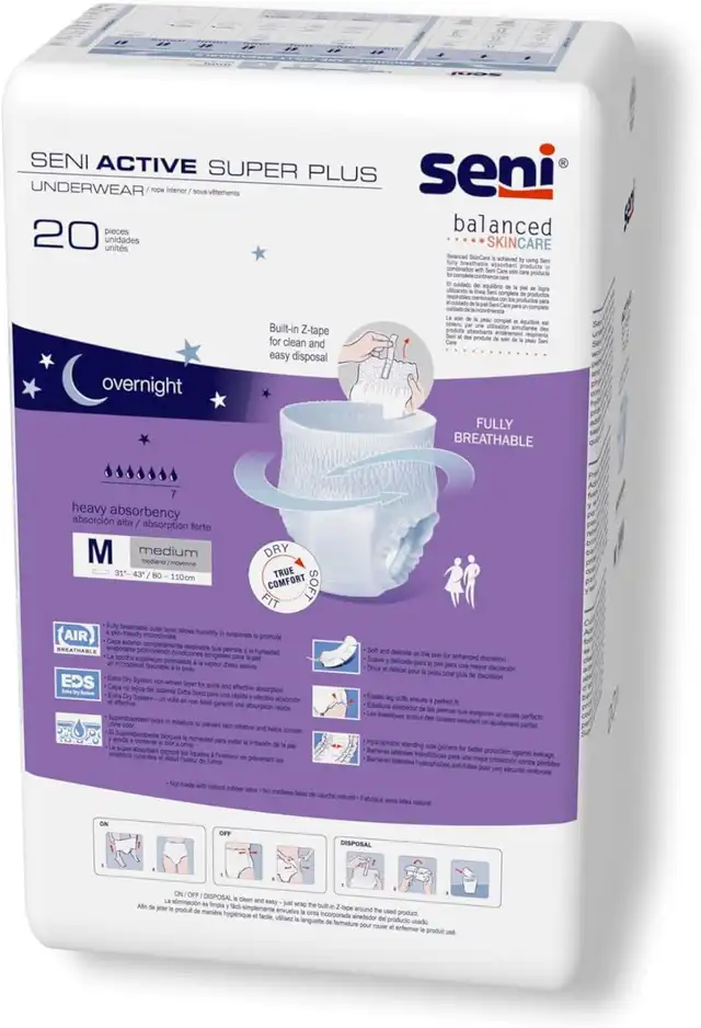Seni Active Super Plus disposable underwear is designed for individuals with active lifestyles or those undergoing physical rehabilitation. These pull-up style underwear offer reliable protection for heavy incontinence and are ideal for overnight use. With a design that mimics regular underwear, they provide both discretion and exceptional comfort. Nighttime is essential for the body to regenerate, and uninterrupted sleep is crucial. Seni Active Super Plus helps prevent frequent disruptions caused by incontinence, allowing for a more restful night.