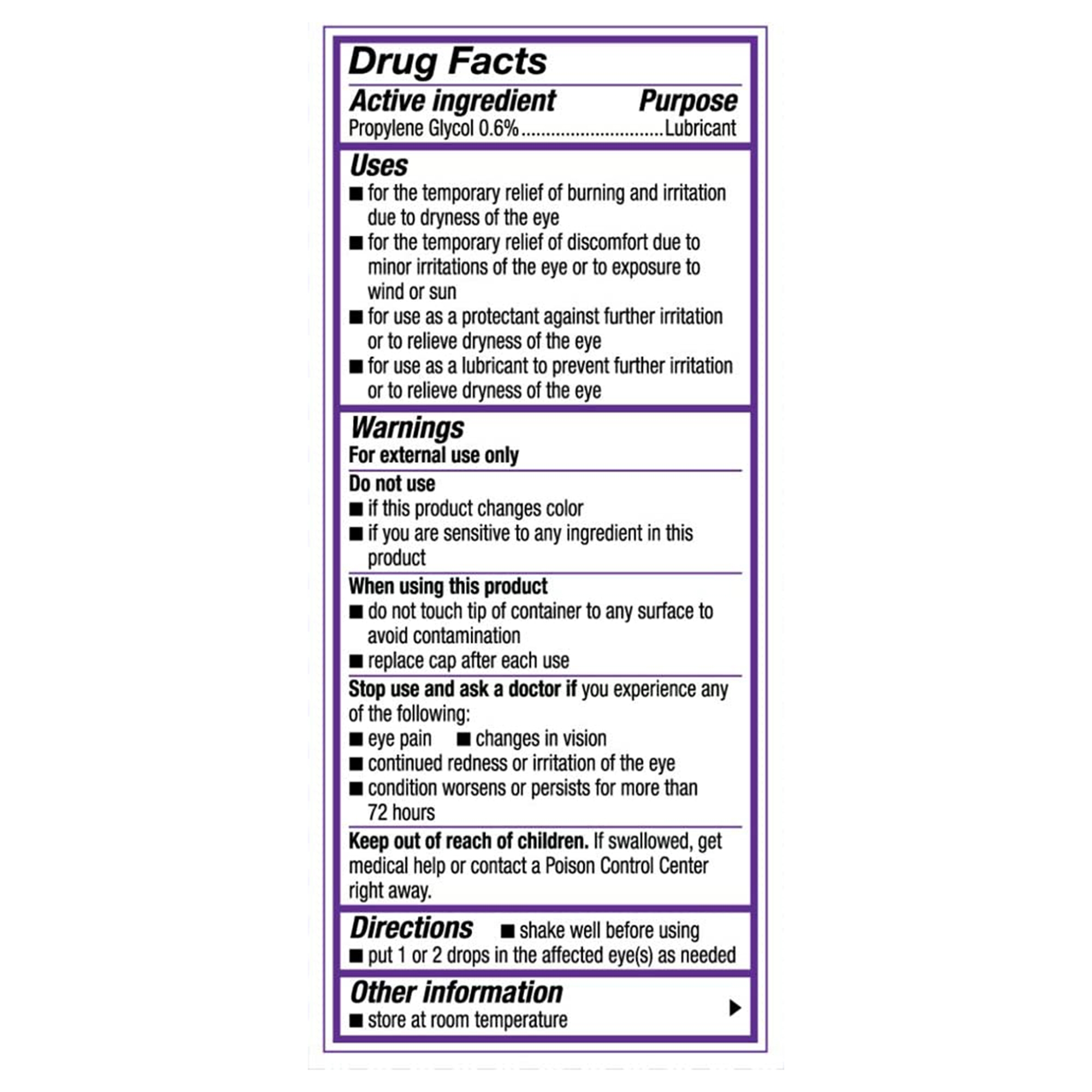 - Use 0.6% propylene glycol lubricant for the temporary relief of burning and irritation caused by dryness of the eye; use for the temporary relief of discomfort due to minor irritations of eye, such as that caused by exposure to wind or sun; use as a protectant against further irritation