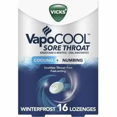 Vicks VapoCool Lozenges provide fast-acting sore throat relief with a cooling, numbing sensation. Infused with Benzocaine, these lozenges help reduce throat and mouth discomfort. Conveniently packed in a 16-count size, they’re perfect for relief anytime, anywhere.